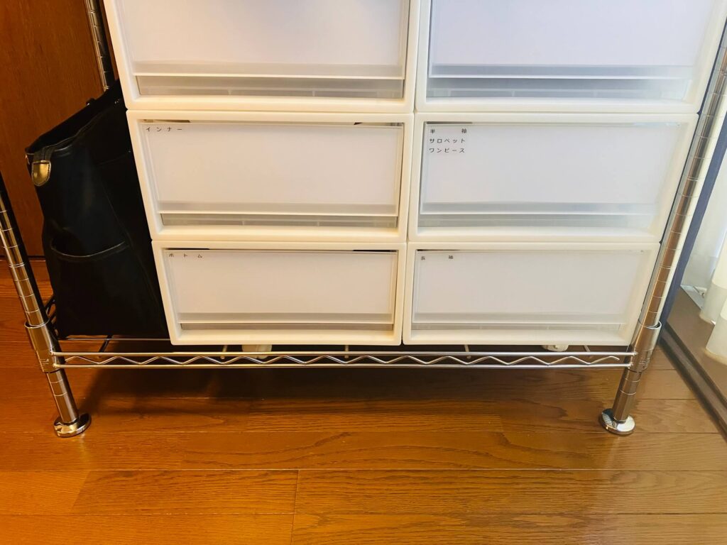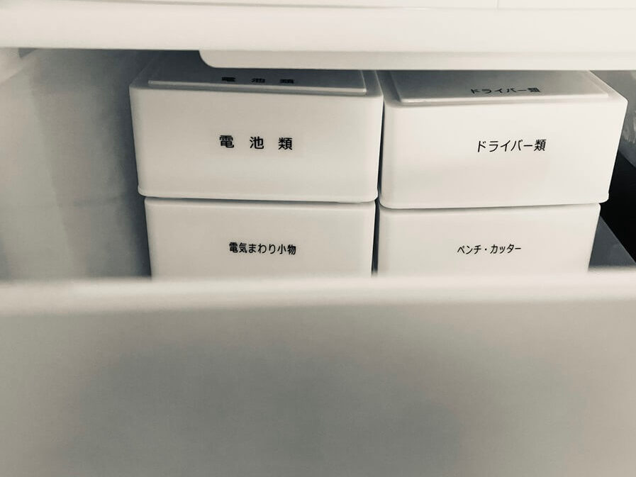ラベルは「全て位置を統一」ではなく、「収納から取り出す際に見やすい位置に貼るもの」と思ってください。(下の引き出し中のボックス収納の写真では、前側正面と上面の両方に貼り、出し入れ時も使用時も分かりやすくしています。)